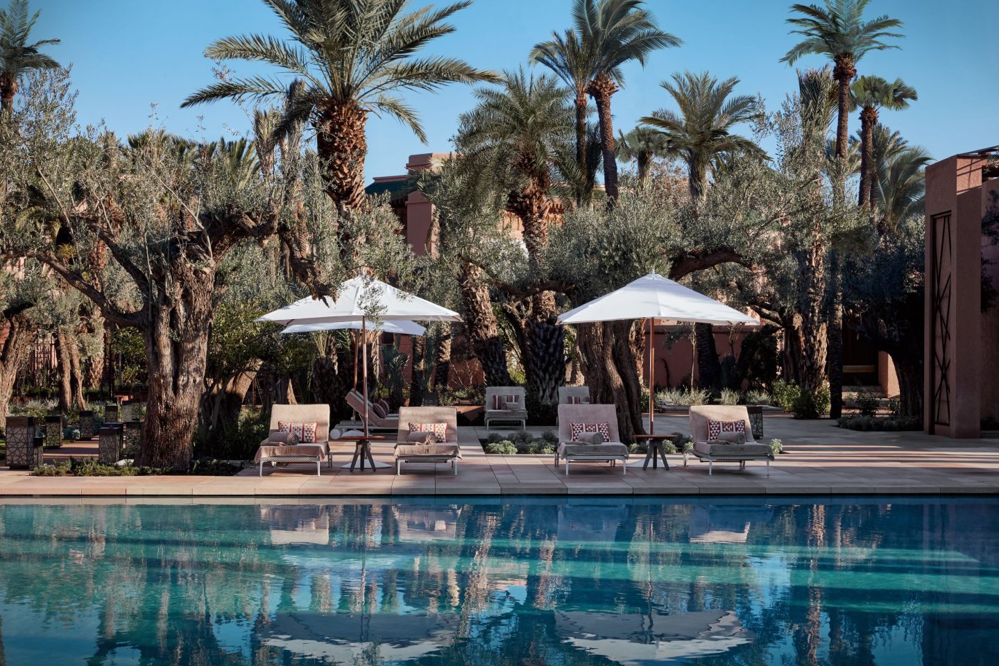 We felt instantly more relaxed by merely stepping into the soothing elegant spa. It’s a symphony in white, from walls to chairs, and it’s all deliciously cool and calm after the heat outside. Treatments include an indulgent hammam (this is Morocco, after all), which if you’ve never tried, you definitely should. Less steamy but just as peaceful is the vast outdoor pool with private pavilions.